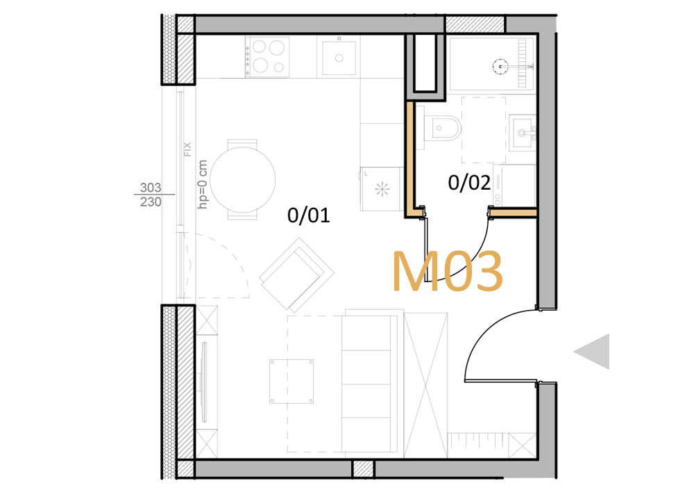 Salon + Aneks kuchenny 22.71 m2